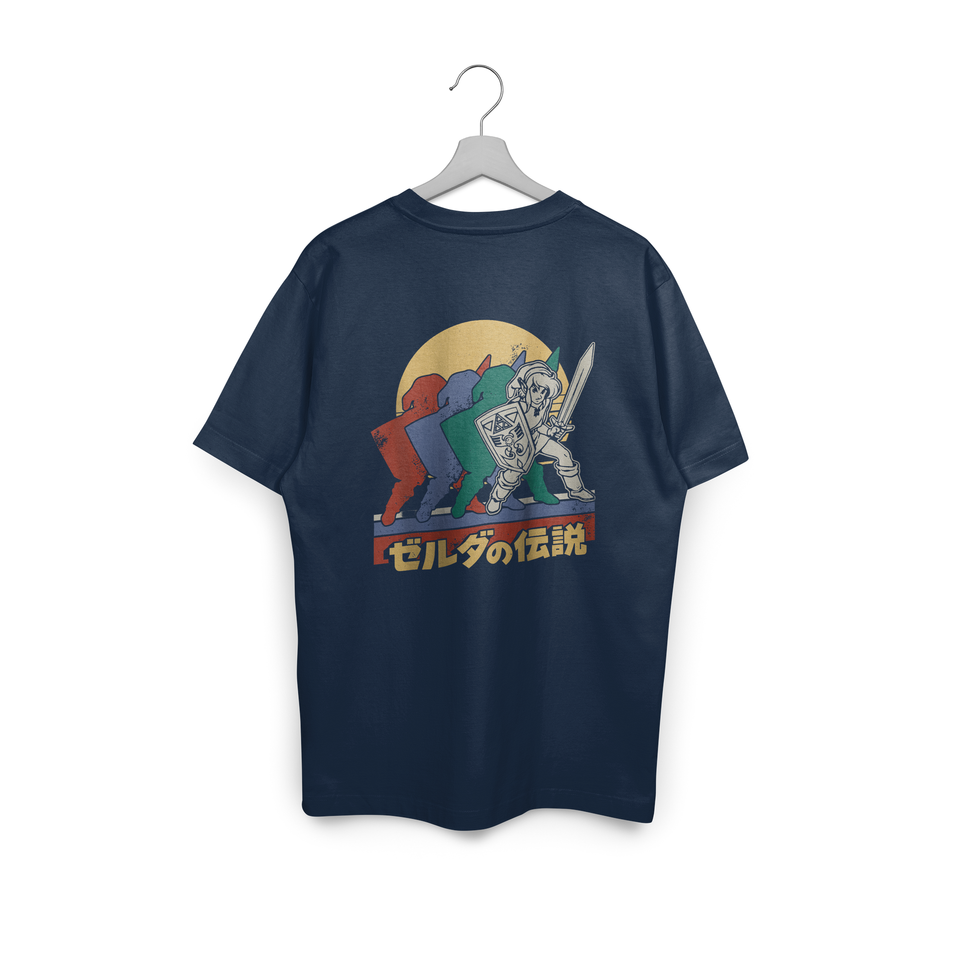 El diseño muestra una composición dinámica: varias sombras de Link en tonos rojo, verde y azul avanzan hacia delante, simbolizando la aventura, el progreso y la esencia del héroe de Hyrule. En primer plano, Link aparece con su espada y su escudo, trazado con un estilo clásico que encaja perfectamente con la estética ochentera. Bajo él, el texto en japonés aporta ese toque import japonés tan buscado por los fans.