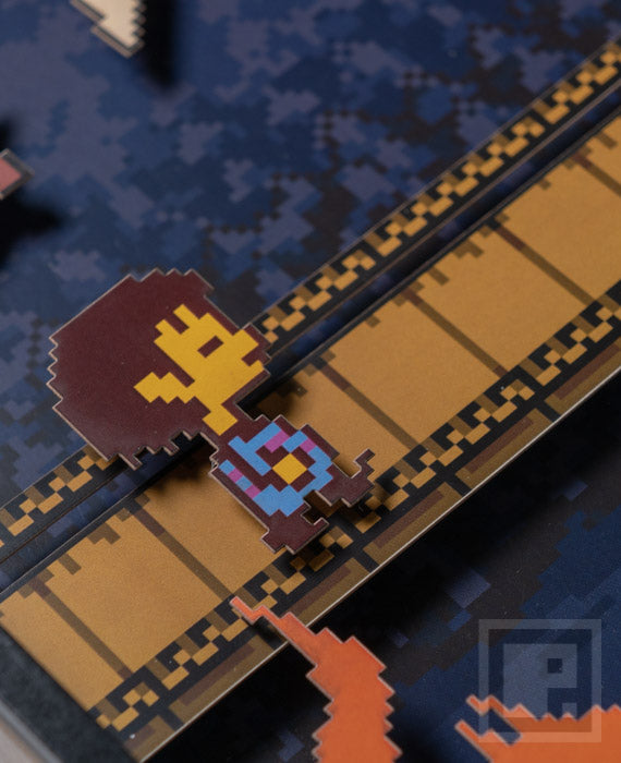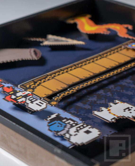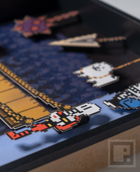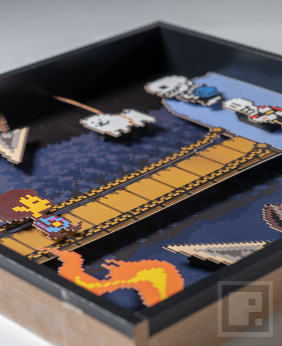 Cada elemento de la escena —los personajes, las trampas, el puente y el fondo— ha sido cuidadosamente recortado y montado a mano en distintas capas, logrando un efecto tridimensional real que aporta profundidad y vida a la composición. Su marco tipo shadow box convierte esta pieza en un objeto de colección imprescindible para los fans del universo creado por Toby Fox.