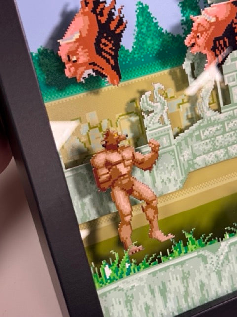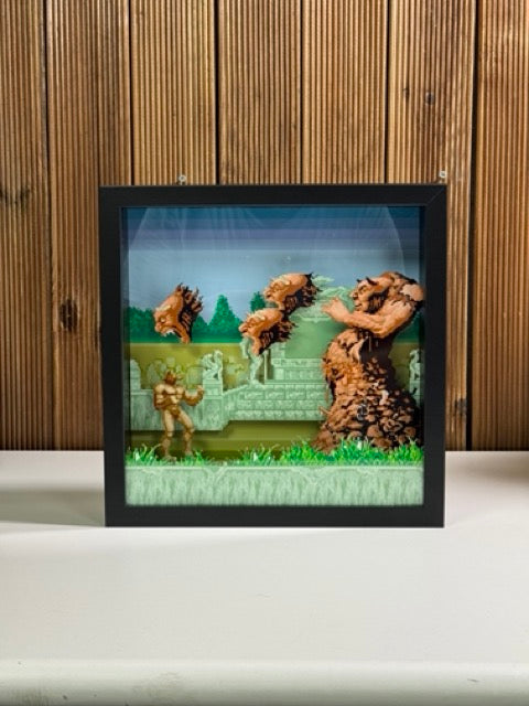 « Relevez-vous de votre tombe ! » Cette phrase emblématique ouvre Altered Beast , l'un des classiques les plus appréciés de SEGA. Ce diorama 3D artisanal recrée la bataille épique contre le premier boss du jeu, un monstre gigantesque qui lance des projectiles dans un combat inoubliable.