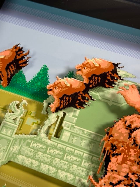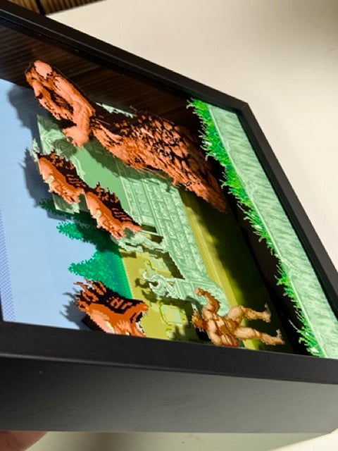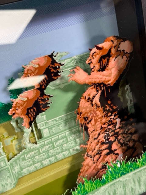 Chaque élément de la scène – le héros transformé, le boss et l'arrière-plan du niveau – a été imprimé sur du papier photographique haute résolution, découpé au laser avec précision et superposé à la main pour créer un effet 3D réaliste . Le résultat, présenté dans une boîte à ombres de haute qualité , est une pièce unique rendant hommage aux origines et à l'héritage 16 bits de SEGA.