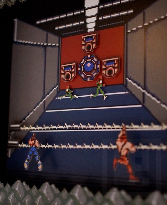 Scène de la deuxième mission de Contra sur NES. Mode deux joueurs et perspective saisissante grâce à la ligne laser.