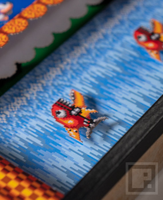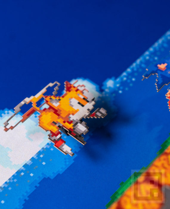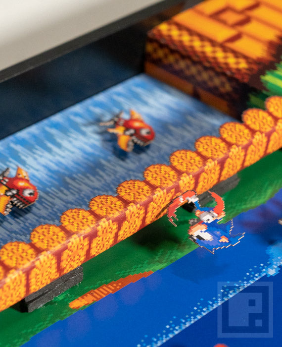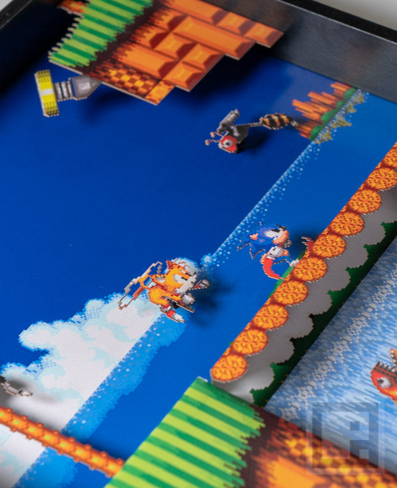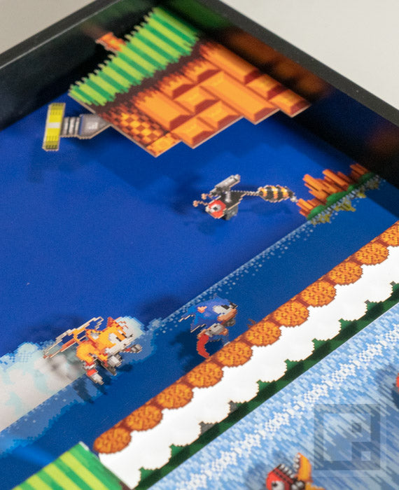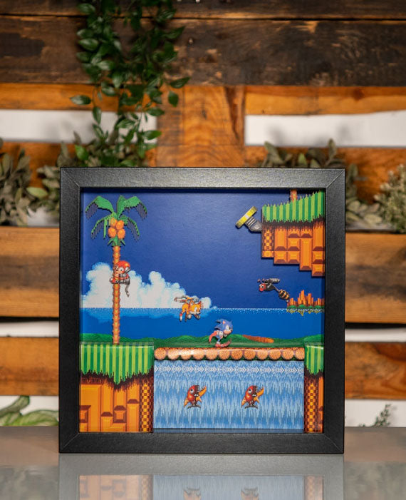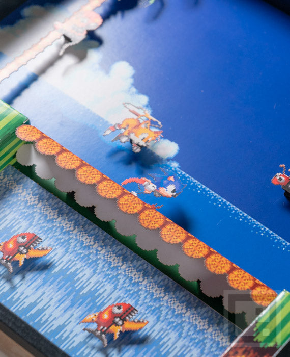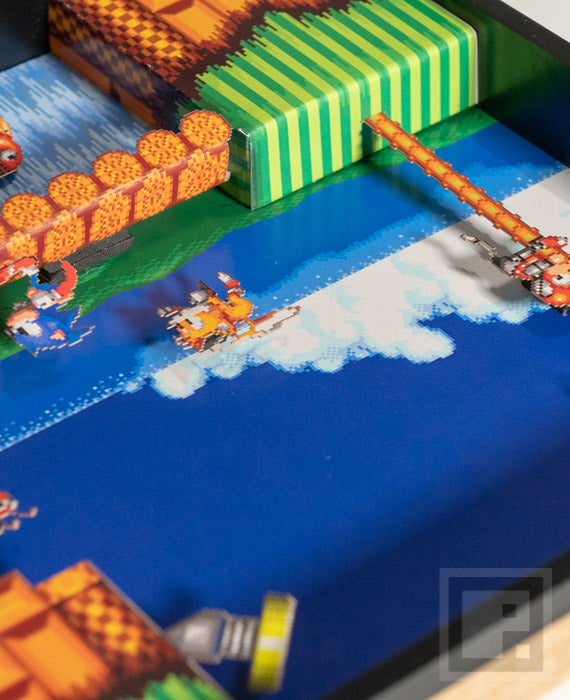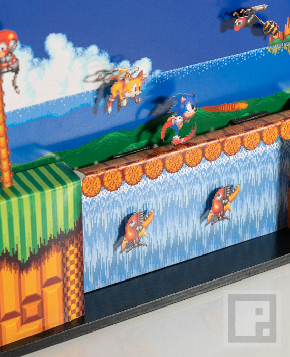 Parcourez la légendaire zone Emerald Hill avec ce diorama 3D réalisé à la main, tiré de Sonic the Hedgehog 2 , l'un des titres SEGA Mega Drive les plus appréciés. La scène met en scène Sonic et Tails affrontant les ennemis mécaniques classiques du Dr Robotnik, avec des palmiers, des cascades et des plateformes qui évoquent toute la magie du pixel art original.