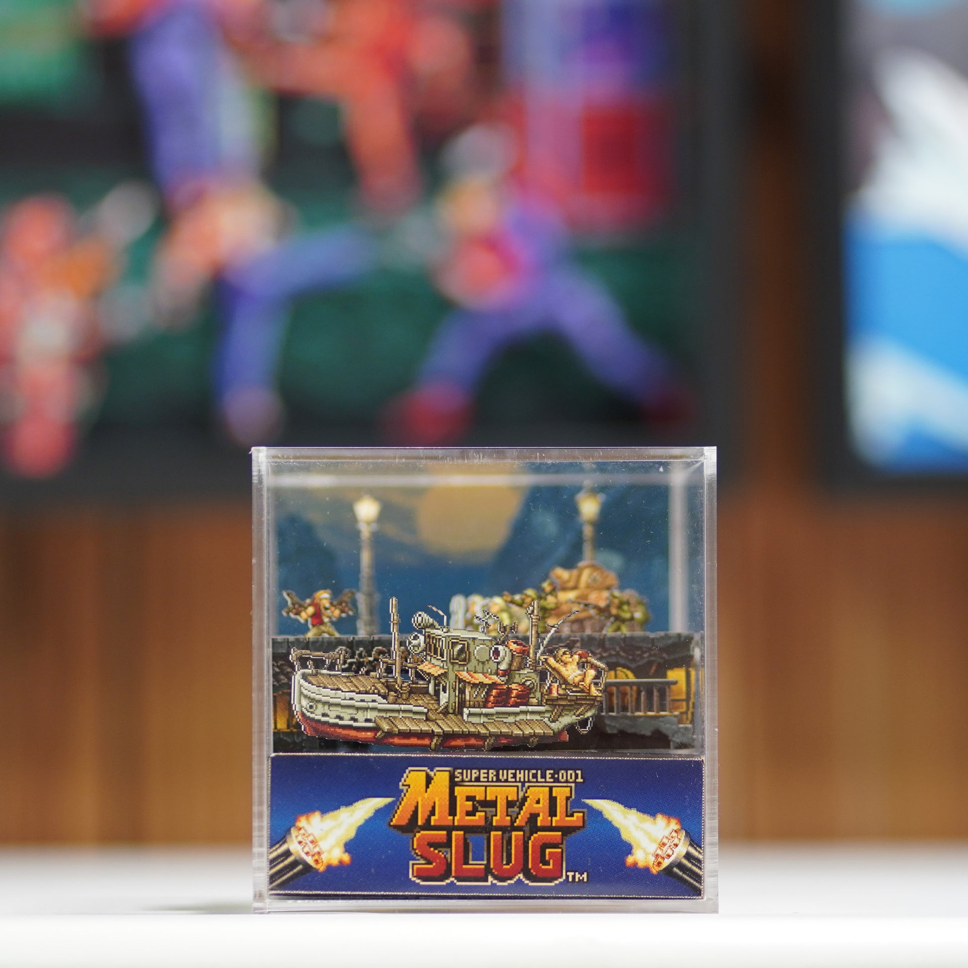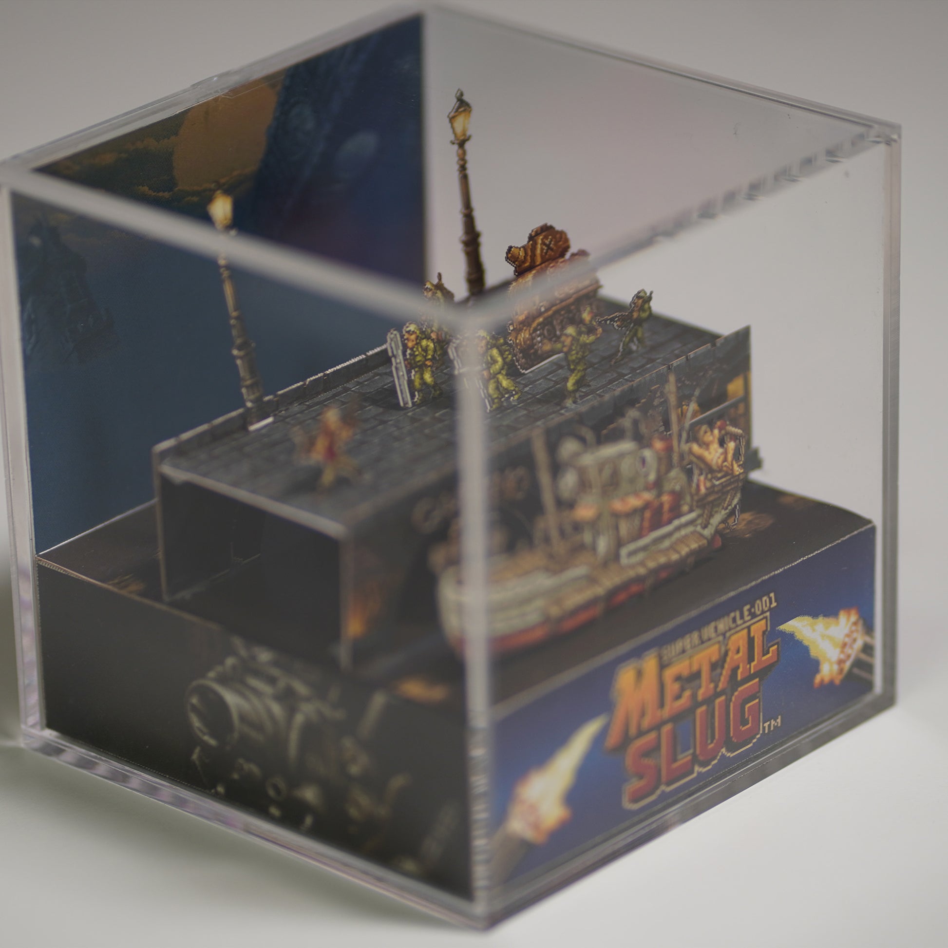 Cube spectaculaire de 10 x 10 x 19 centimètres. Scène amusante de Metal Slug sur le pont de la première mission, avec plusieurs soldats en escouade.