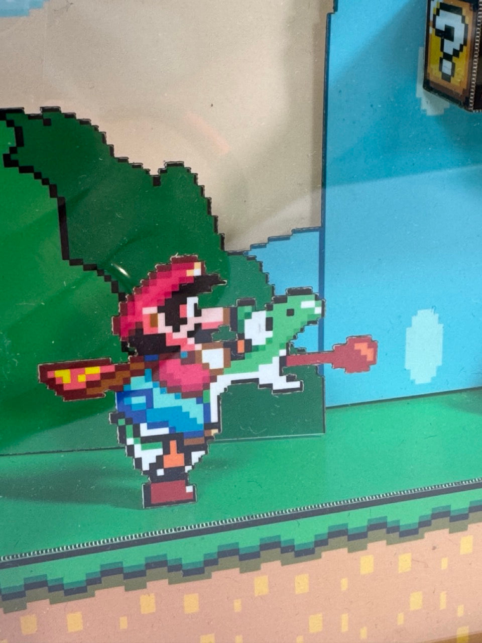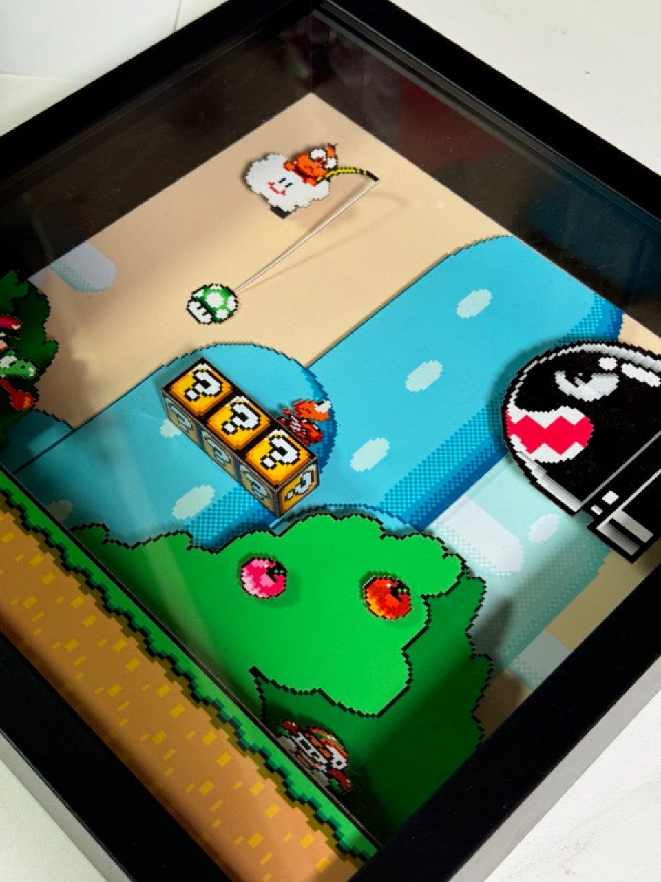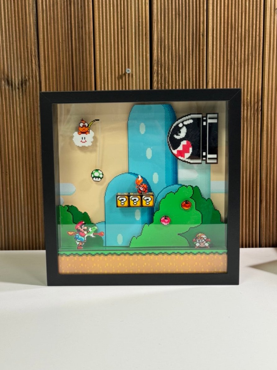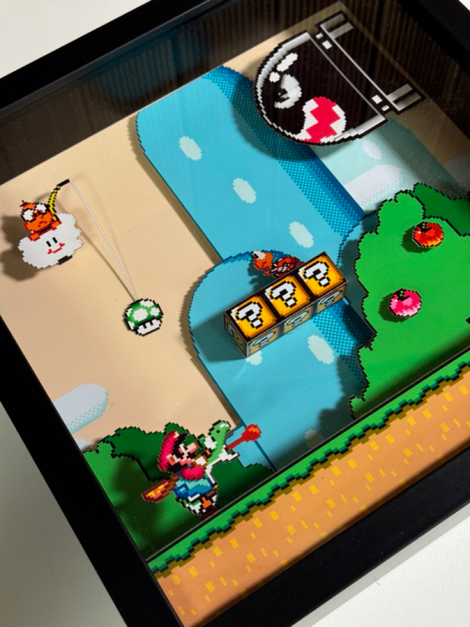 Plongez dans la magie de Super Mario World , le classique de la Super Nintendo, avec ce spectaculaire diorama 3D réalisé à la main . La scène met en scène Mario chevauchant Yoshi alors qu'il combat certains des ennemis les plus emblématiques du jeu, dont Lakitu , Bullet Bill et les classiques boîtes à points d'interrogation qui cachent des bonus.