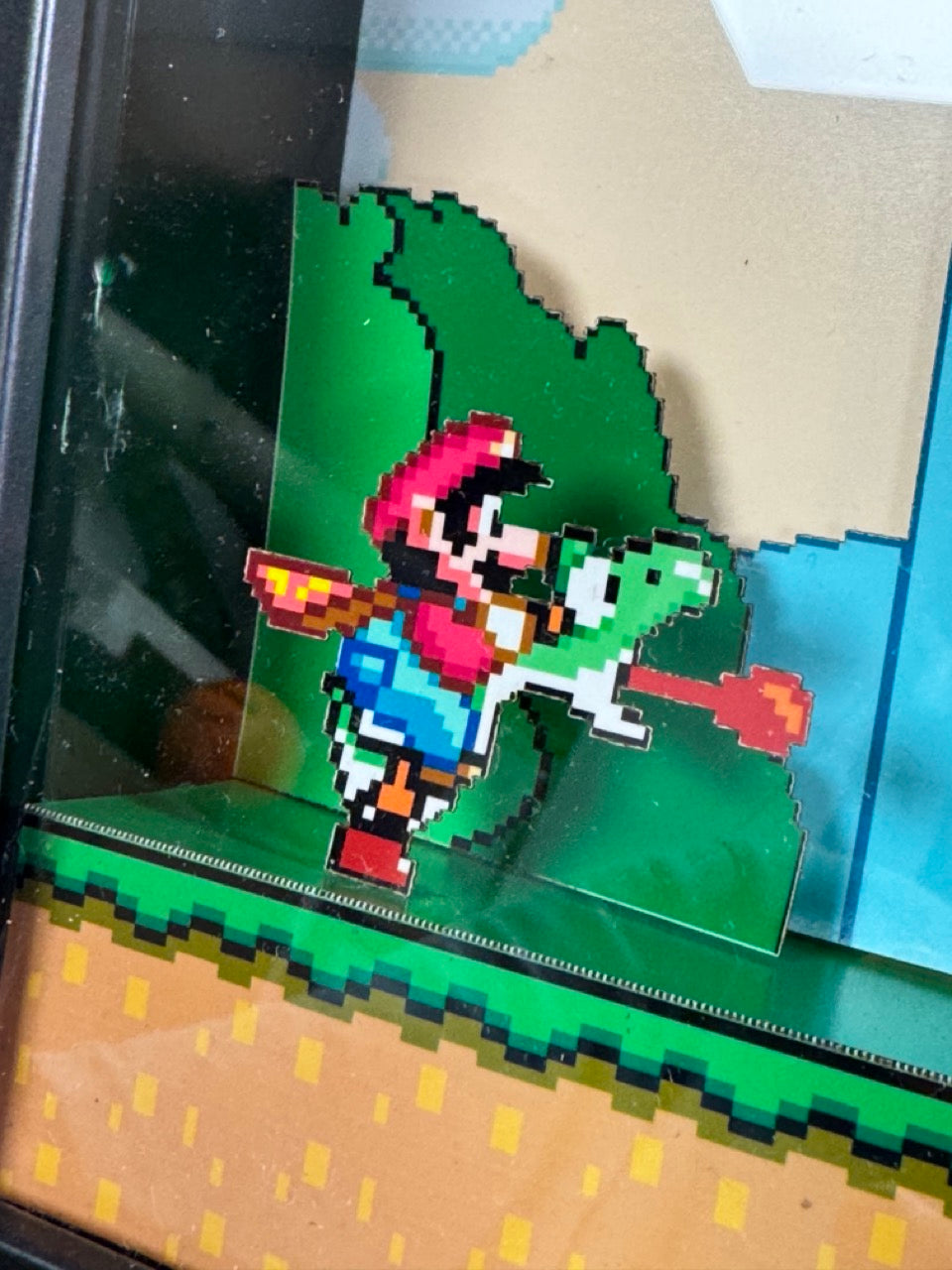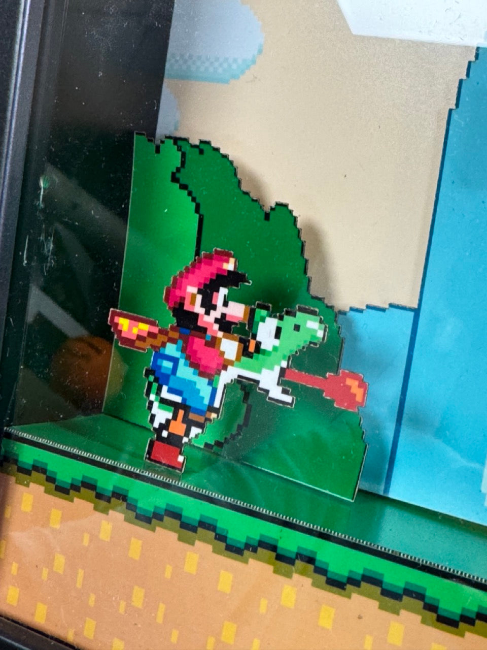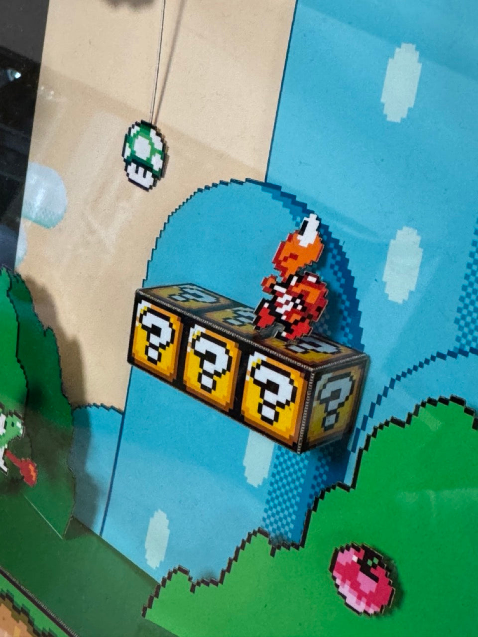 Plongez dans la magie de Super Mario World , le classique de la Super Nintendo, avec ce spectaculaire diorama 3D réalisé à la main . La scène met en scène Mario chevauchant Yoshi alors qu'il combat certains des ennemis les plus emblématiques du jeu, dont Lakitu , Bullet Bill et les classiques boîtes à points d'interrogation qui cachent des bonus.