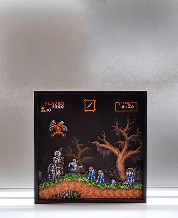 Vivez le combat épique de Sir Arthur contre des hordes démoniaques avec notre diorama Super Ghouls 'n Ghosts . Un hommage au jeu classique qui a mis les joueurs au défi avec sa difficulté et son atmosphère uniques.