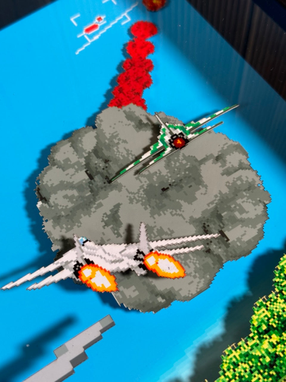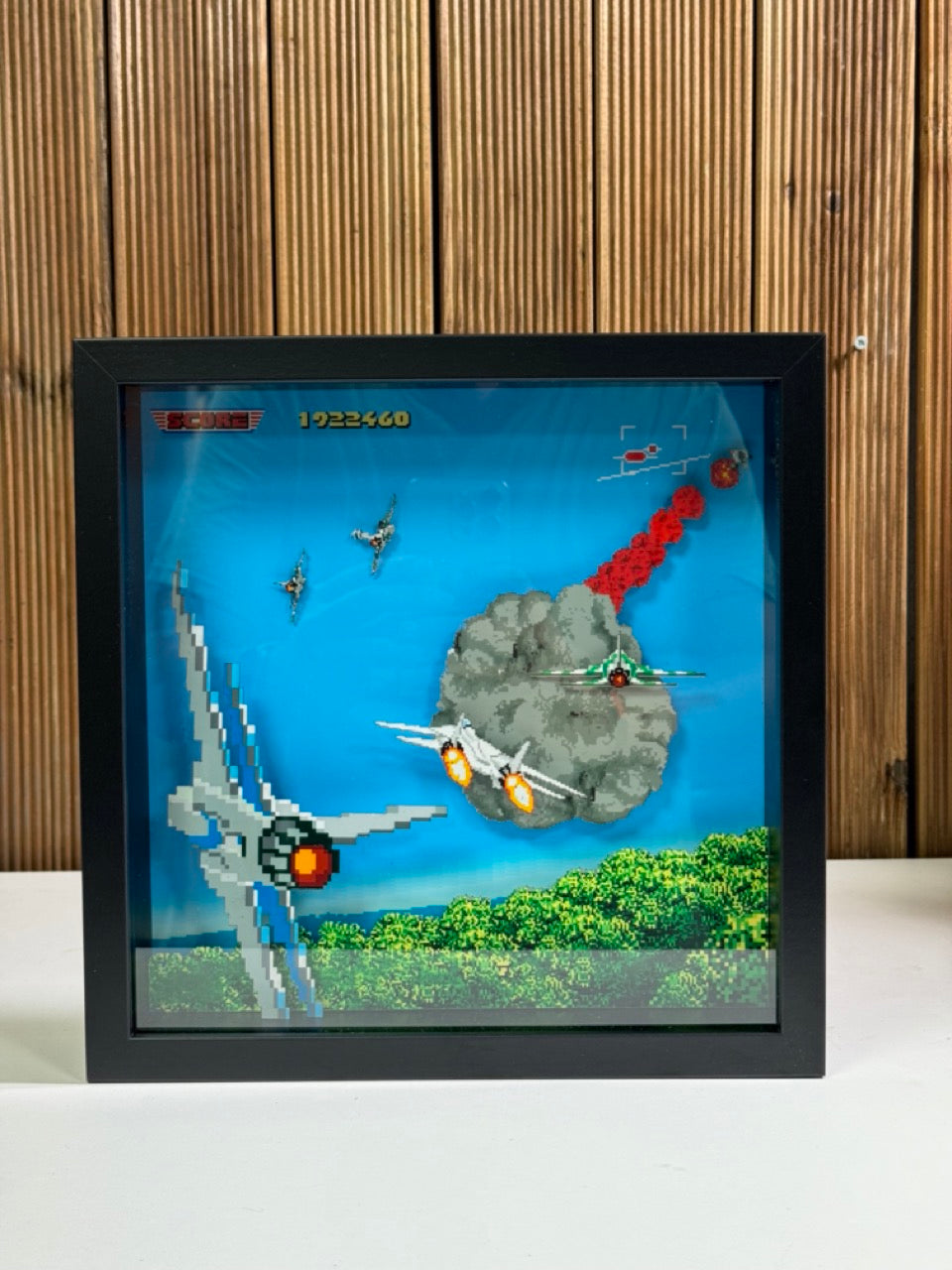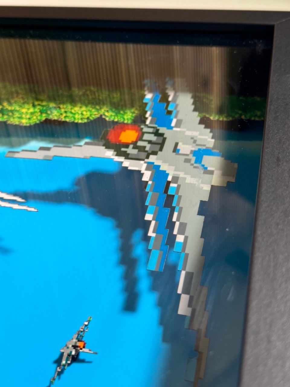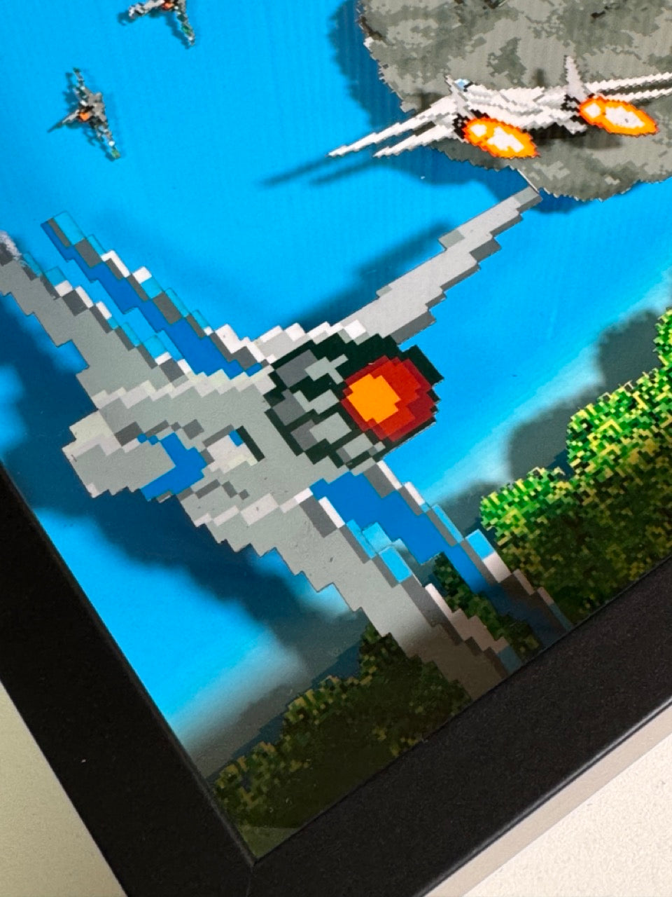 Cada elemento —desde los aviones hasta las nubes y el horizonte pixelado— ha sido impreso en papel fotográfico de alta resolución, recortado con precisión láser y montado a mano en varias capas para lograr un efecto tridimensional real. El acabado en marco tipo shadow box convierte este cuadro en una pieza única, ideal para cualquier amante de los arcades y del legado de SEGA.