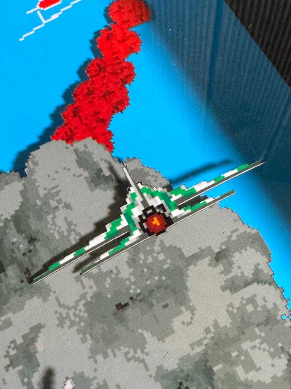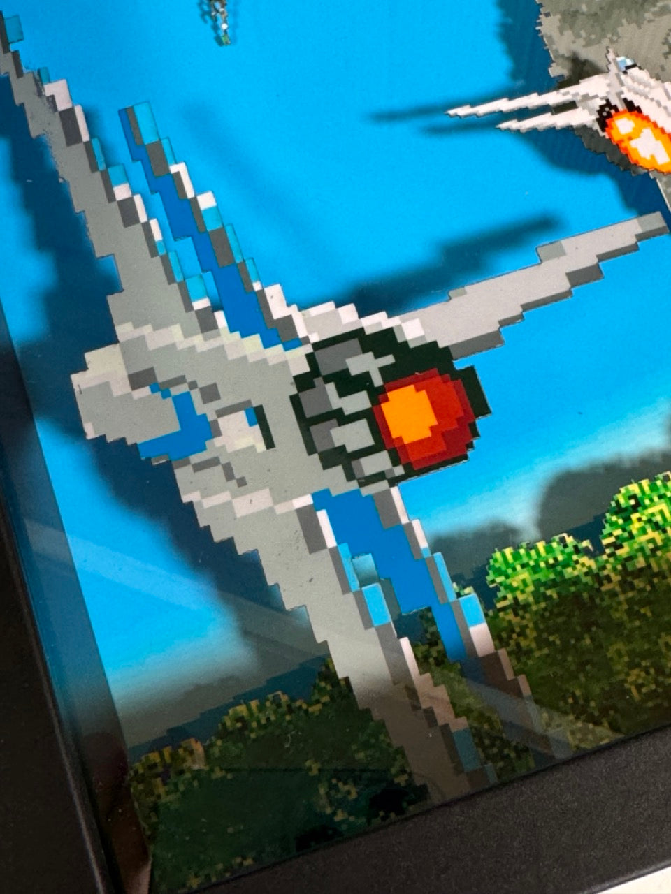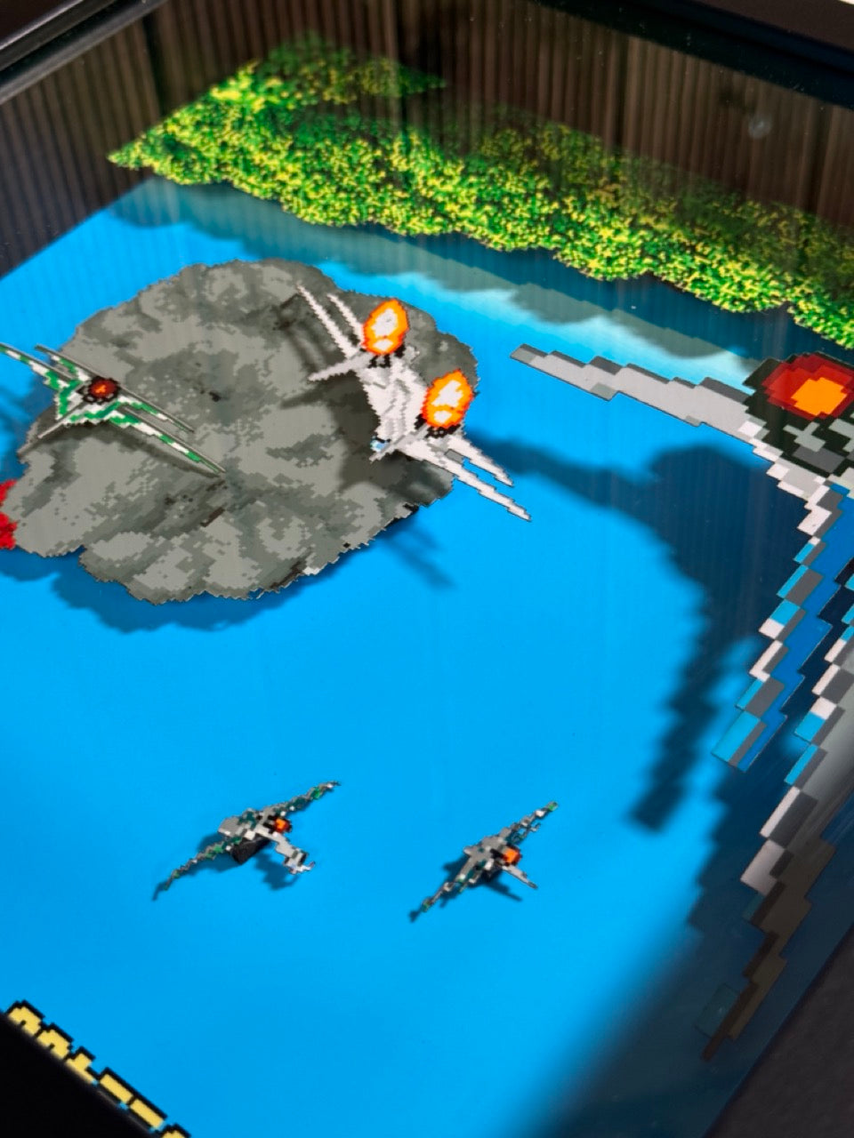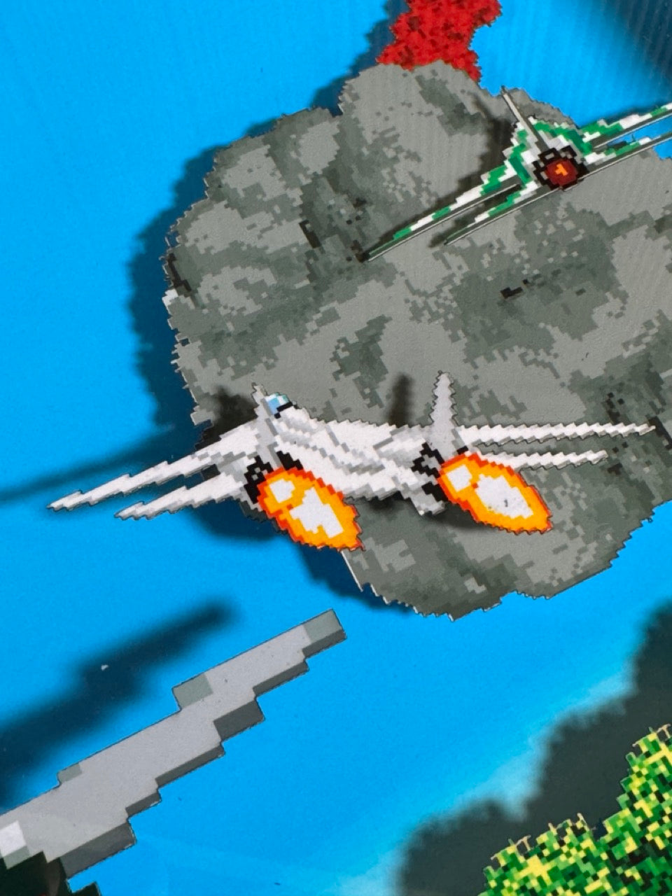 Cada elemento —desde los aviones hasta las nubes y el horizonte pixelado— ha sido impreso en papel fotográfico de alta resolución, recortado con precisión láser y montado a mano en varias capas para lograr un efecto tridimensional real. El acabado en marco tipo shadow box convierte este cuadro en una pieza única, ideal para cualquier amante de los arcades y del legado de SEGA.