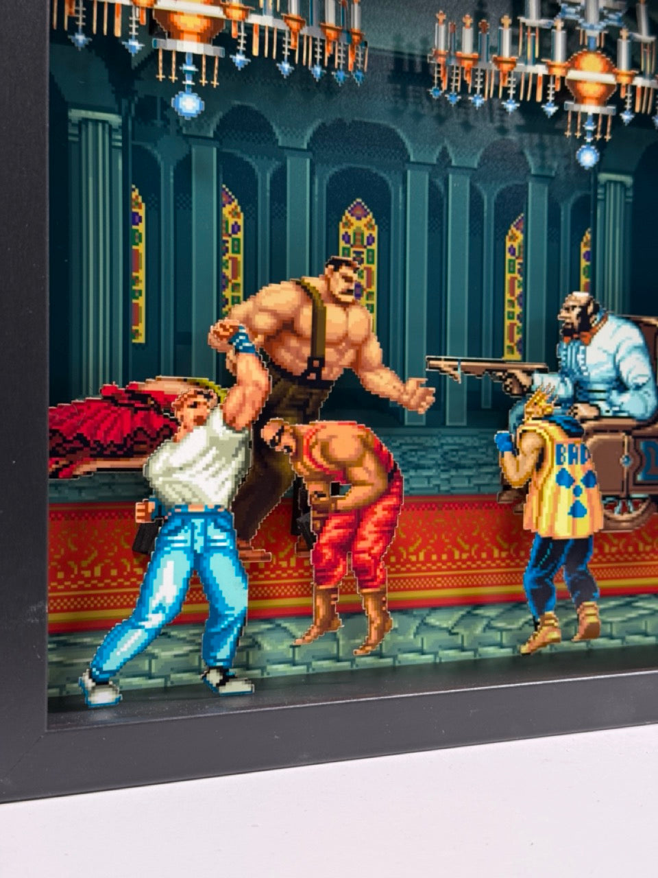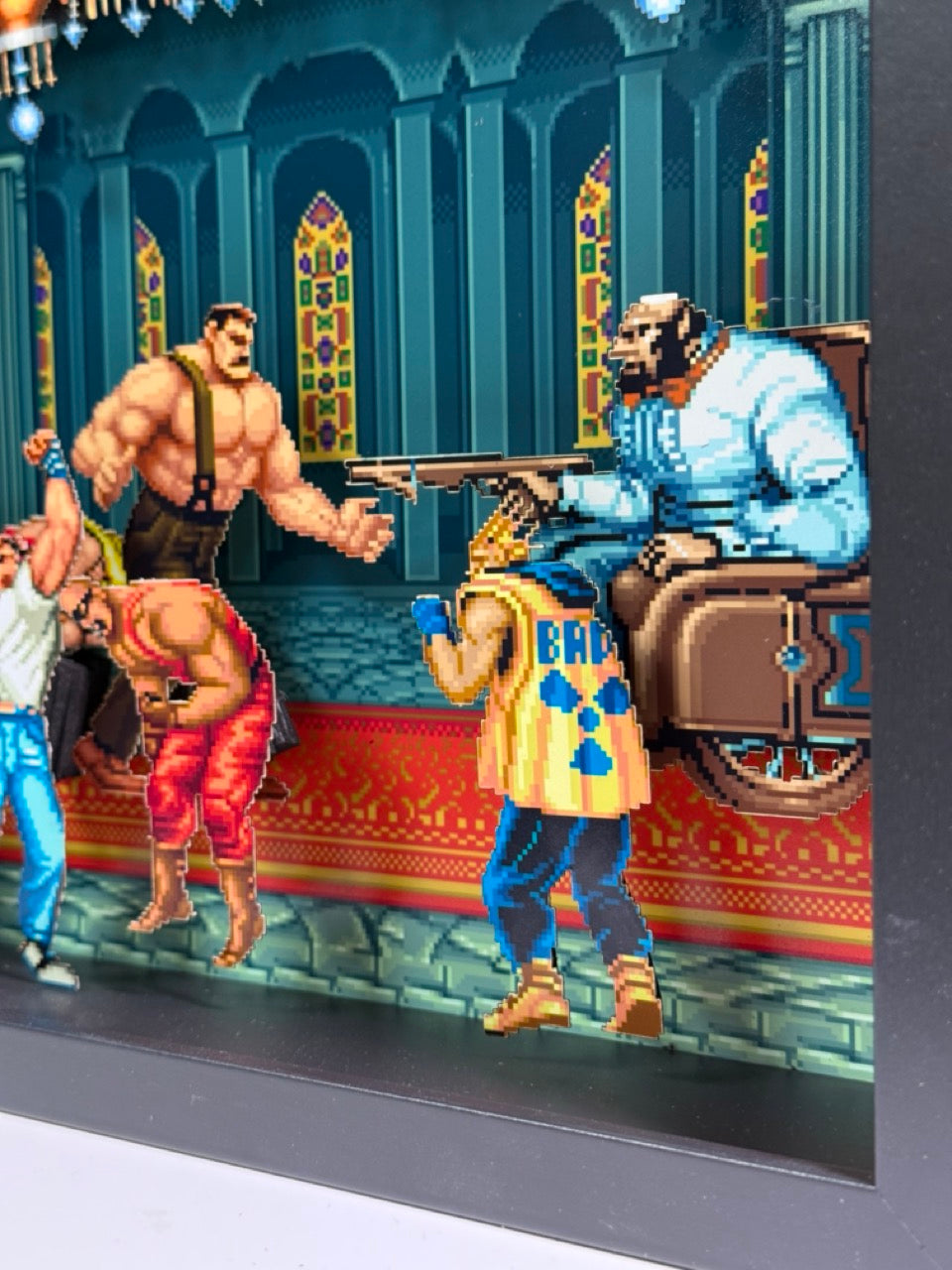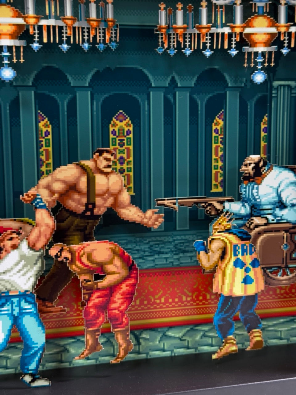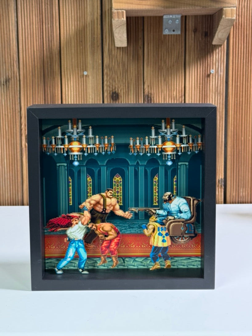 Las calles arden y la pelea contra Damnd está en su punto más intenso. Este diorama 3D artesanal revive la acción del legendario Final Fight, con personajes y escenarios montados en capas para un efecto tridimensional espectacular.