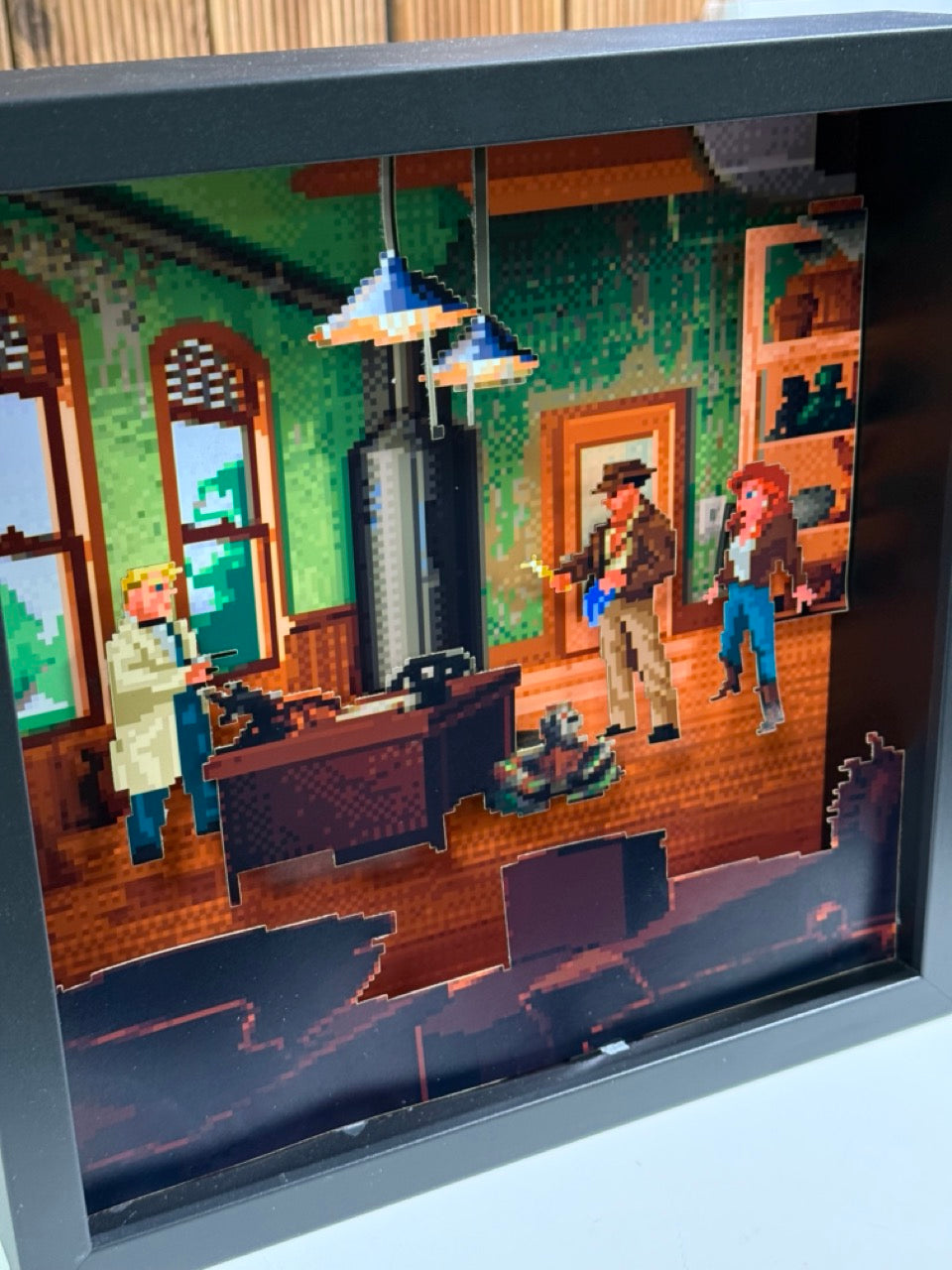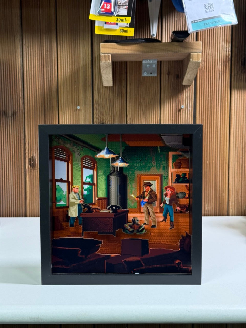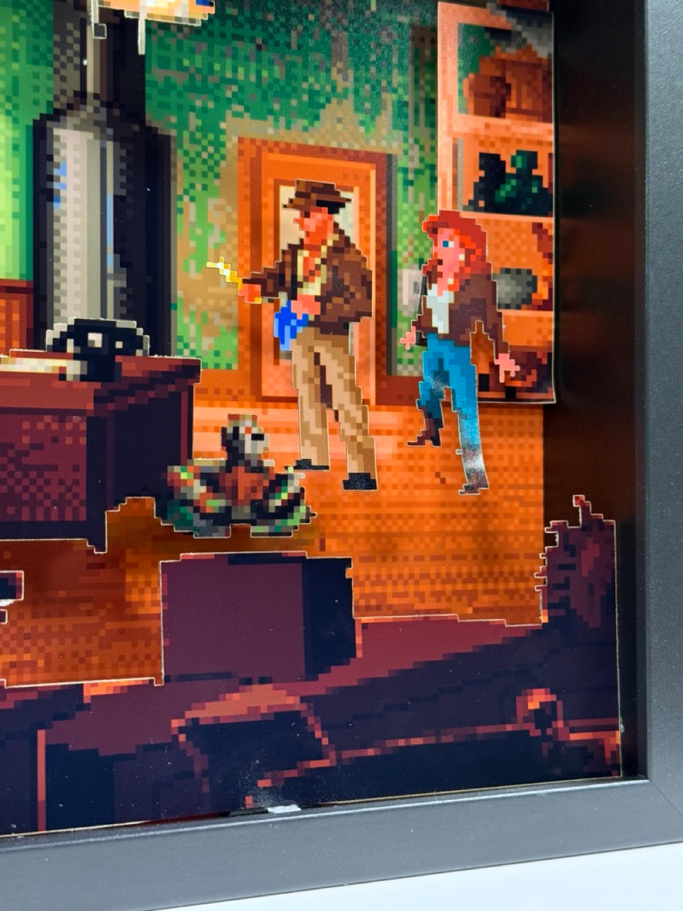 Cada elemento de la composición está montado en capas para conseguir un efecto de profundidad y perspectiva real. Su acabado en marco tipo shadow box lo convierte en una pieza única para coleccionistas de aventuras gráficas.
