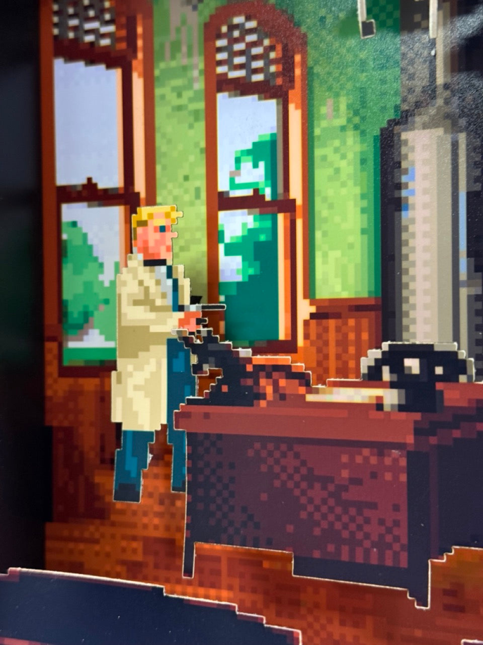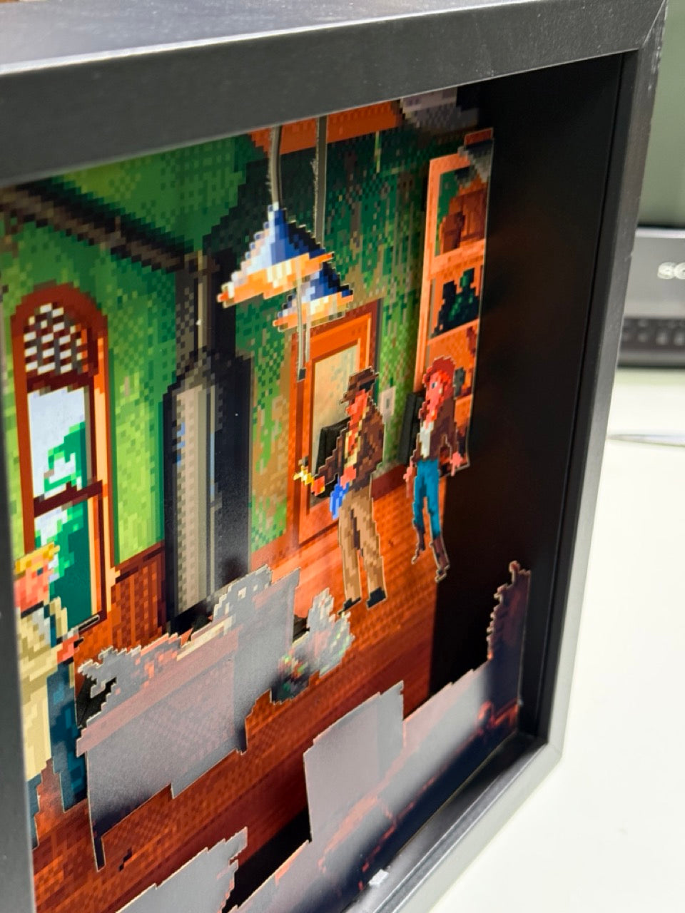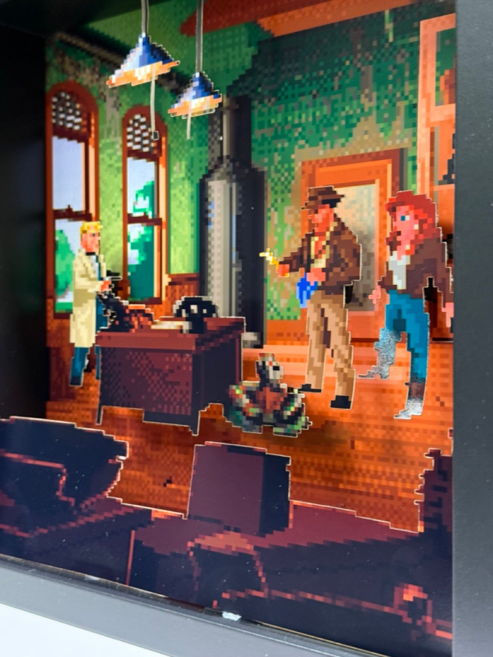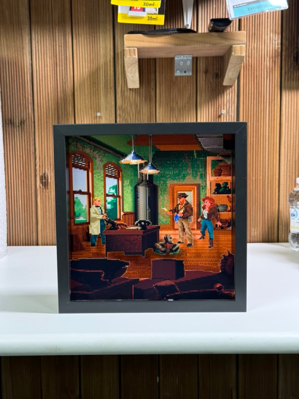 Cada elemento de la composición está montado en capas para conseguir un efecto de profundidad y perspectiva real. Su acabado en marco tipo shadow box lo convierte en una pieza única para coleccionistas de aventuras gráficas.