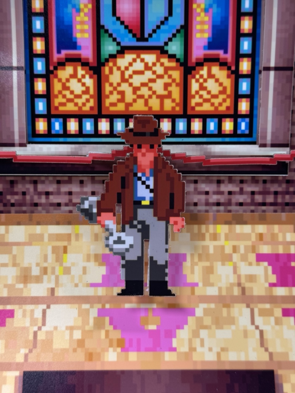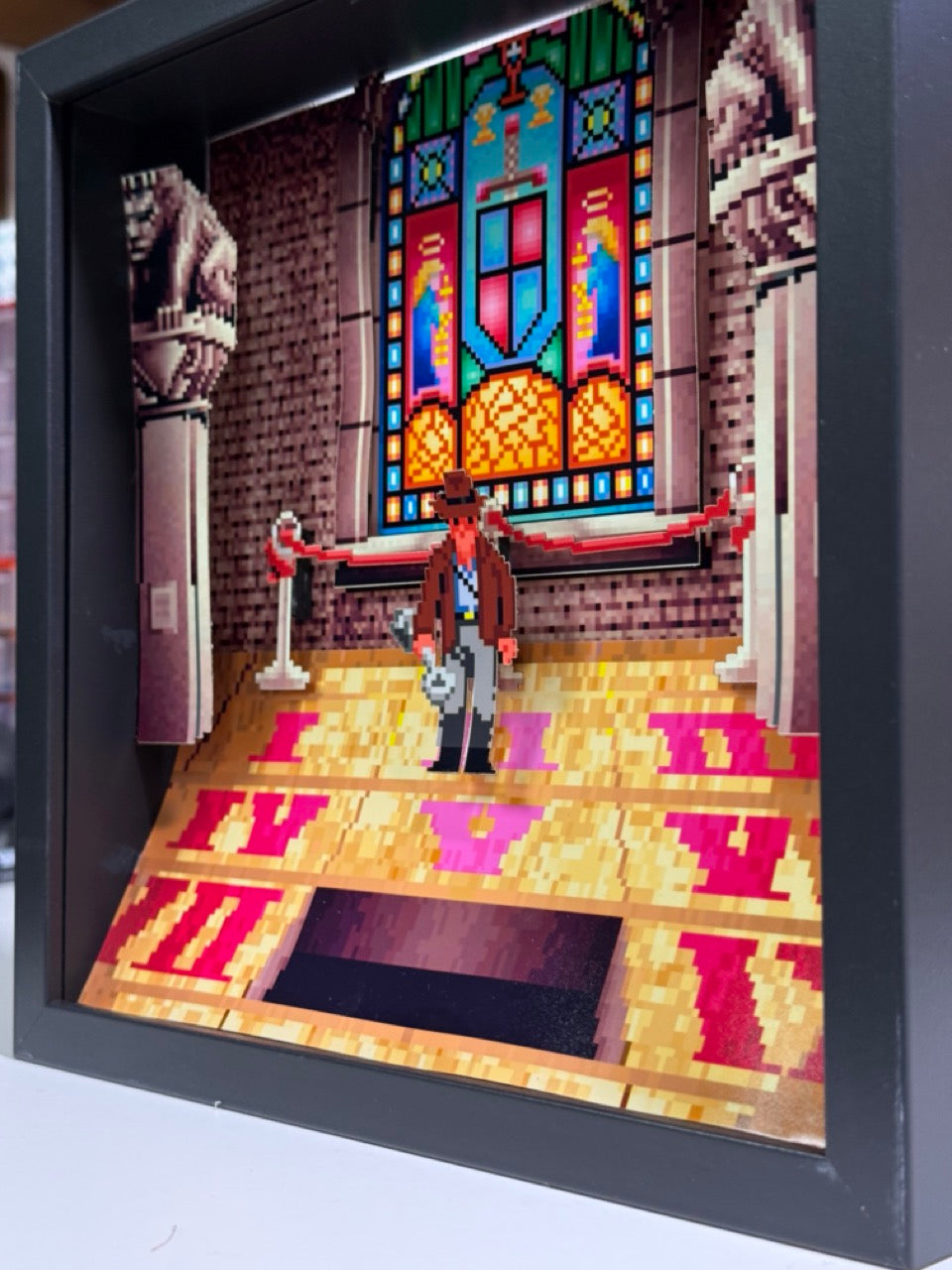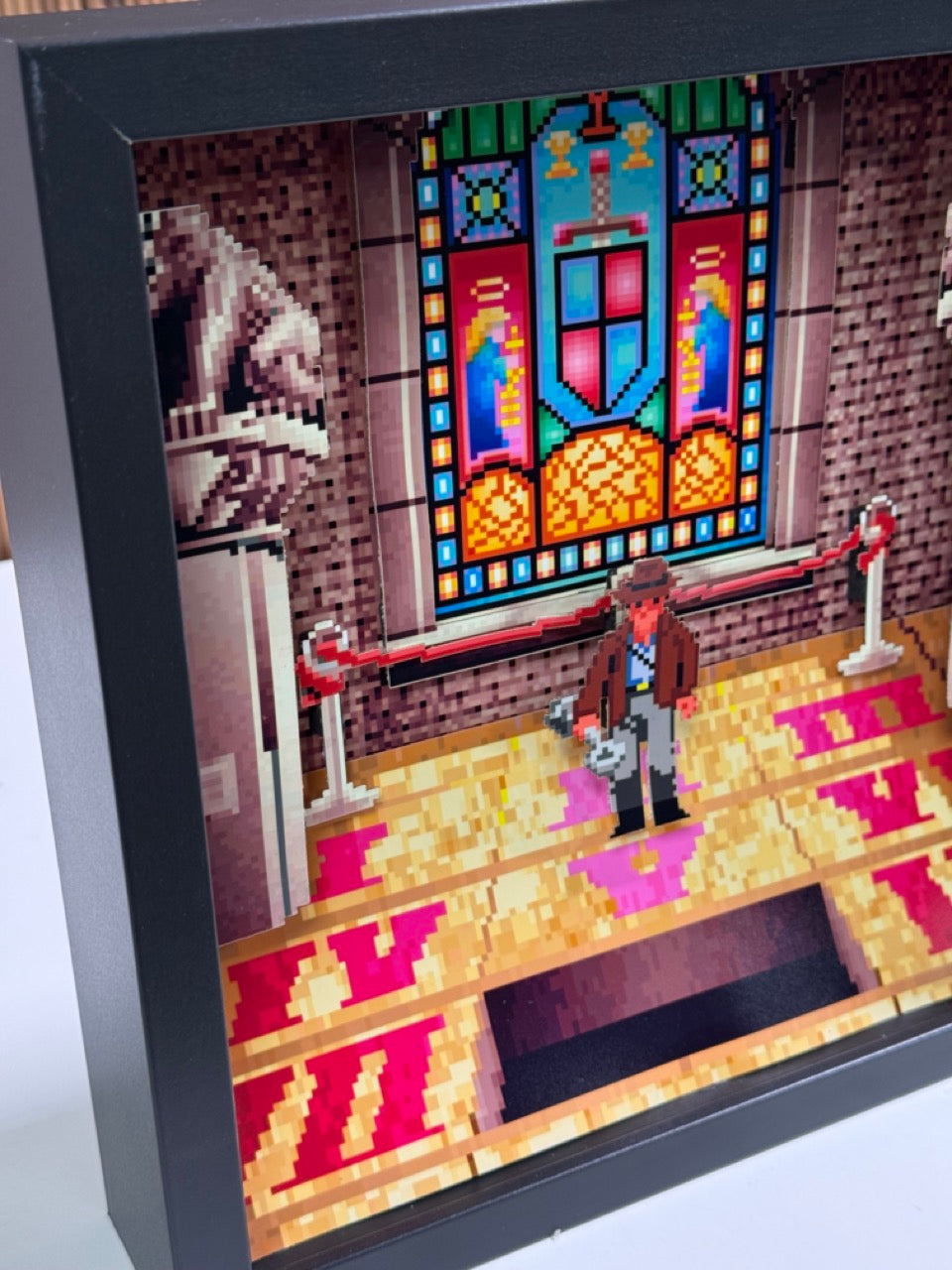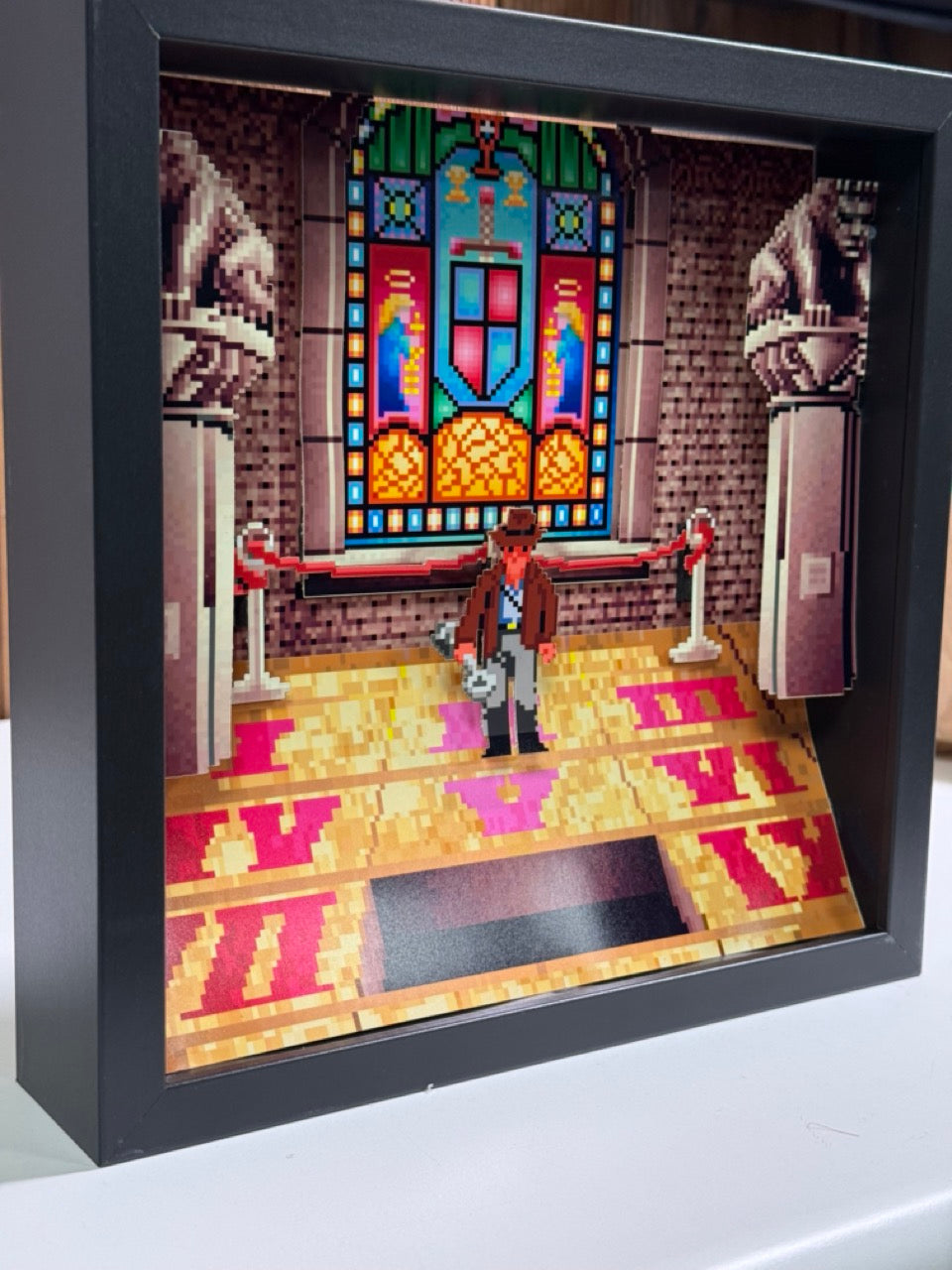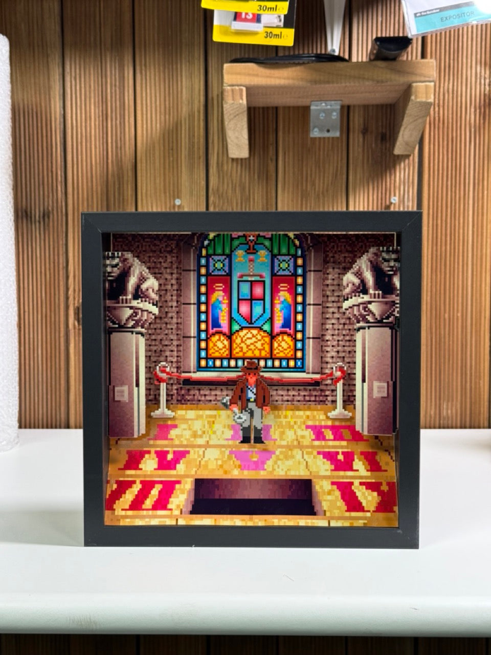 Entre vitrinas y reliquias antiguas, el profesor Indiana Jones investiga las pistas que le llevarán a una de sus aventuras más recordadas. Este diorama 3D artesanal recrea la escena de la biblioteca de Venecia del clásico de LucasArts, manteniendo intacto el encanto del pixel art original.