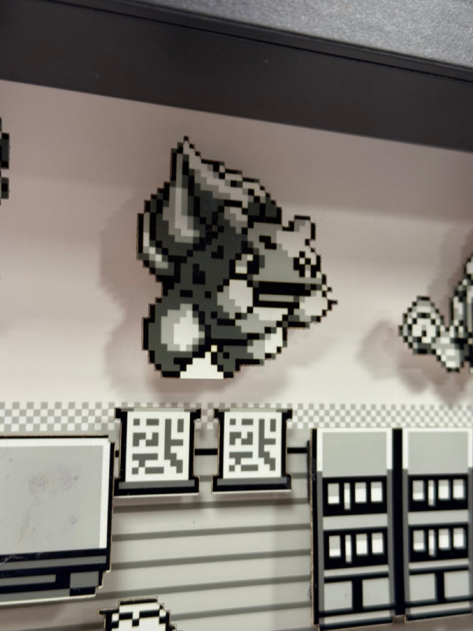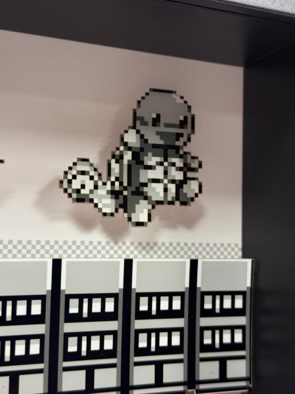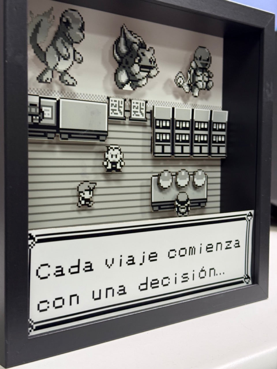 Cada sprite y elemento del entorno se ha montado en capas, generando un efecto tridimensional que resalta cada detalle y otorga vida a la composición. Su presentación en marco tipo shadow box la convierte en una pieza perfecta tanto para exhibir como para regalar a cualquier fan de Pokémon.