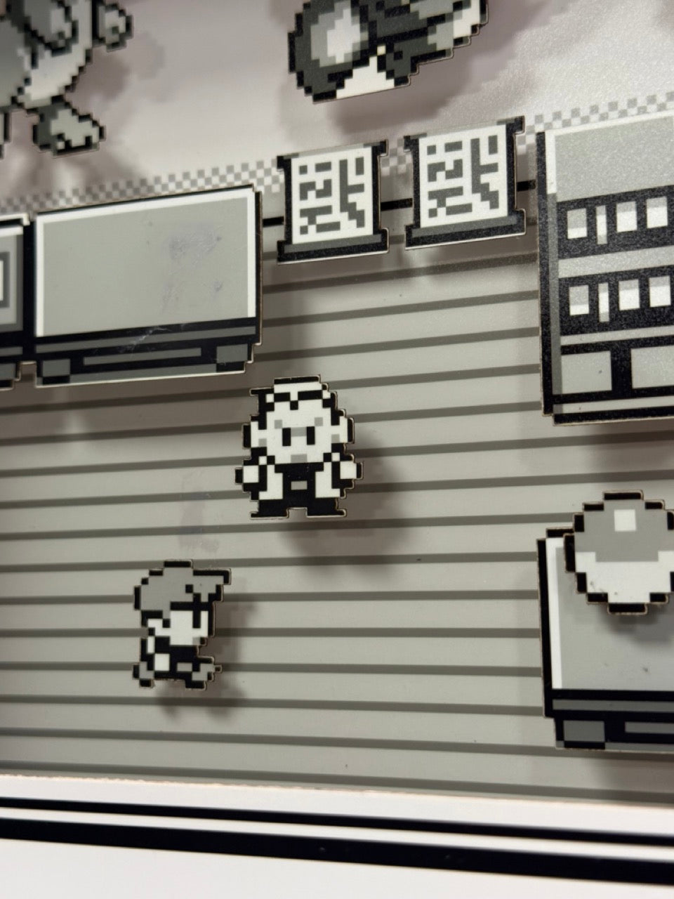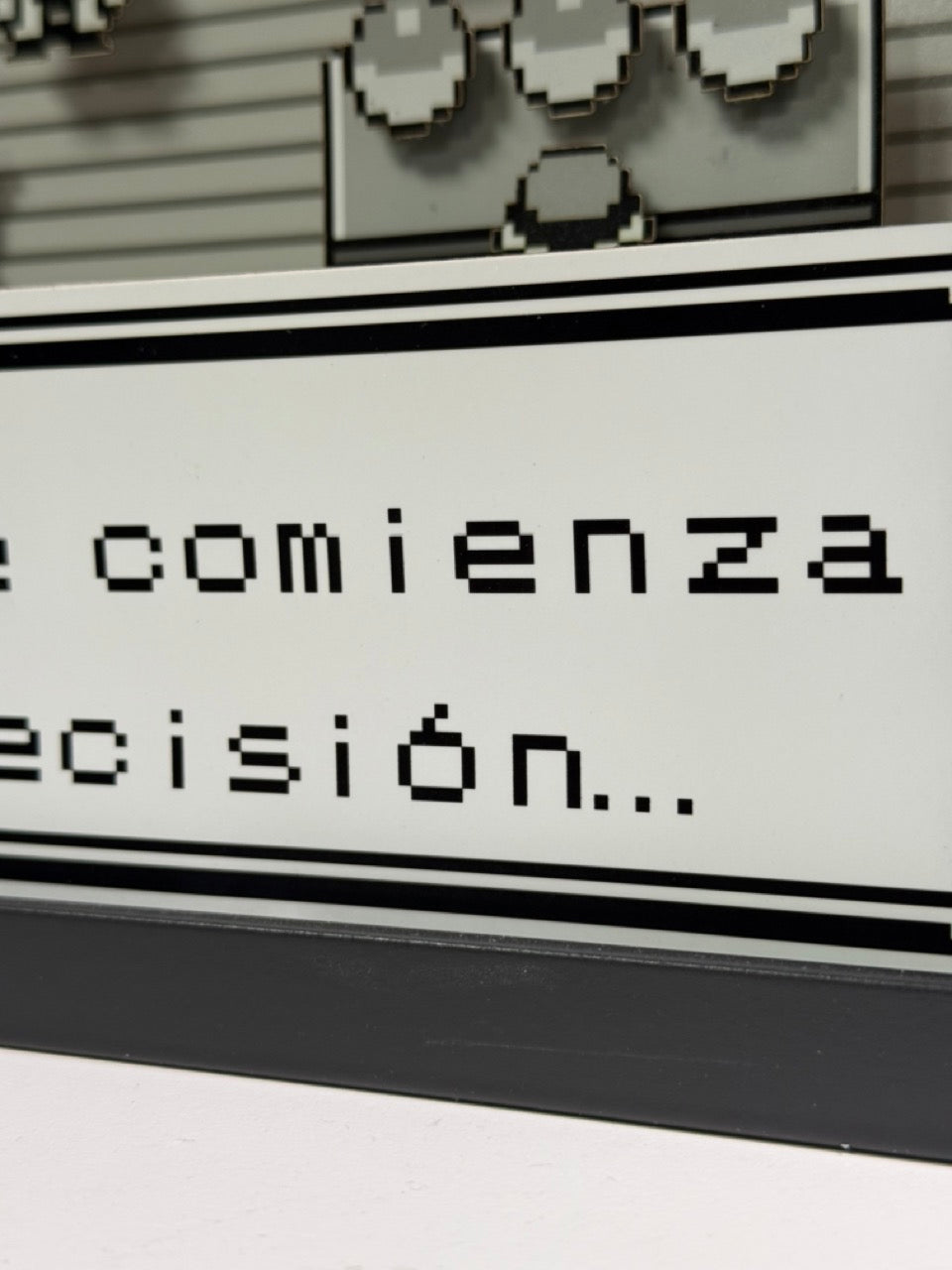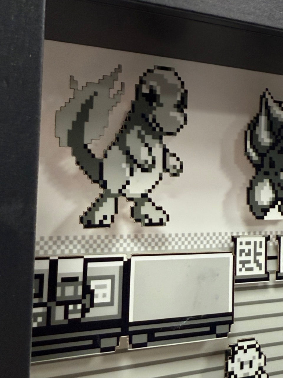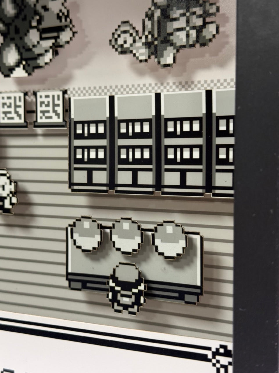 Cada sprite y elemento del entorno se ha montado en capas, generando un efecto tridimensional que resalta cada detalle y otorga vida a la composición. Su presentación en marco tipo shadow box la convierte en una pieza perfecta tanto para exhibir como para regalar a cualquier fan de Pokémon.