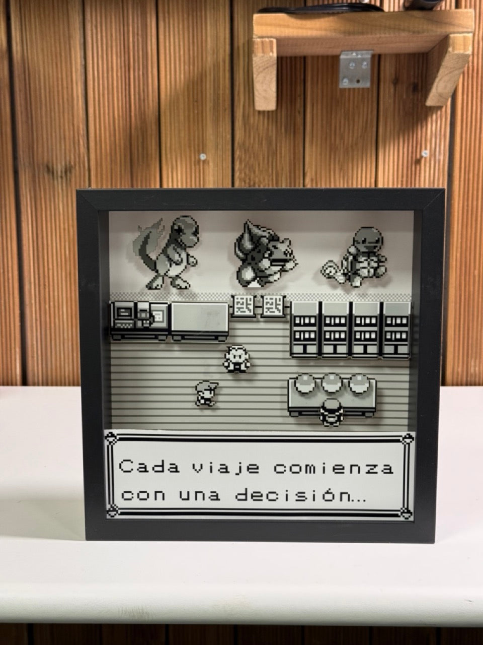 Todo gran viaje comienza con una decisión, y en el laboratorio del Profesor Oak es donde nace la aventura. Este diorama 3D artesanal reproduce con precisión la escena mítica en la que Charmander, Bulbasaur y Squirtle esperan ser elegidos, manteniendo el encanto del pixel art original de Game Boy.